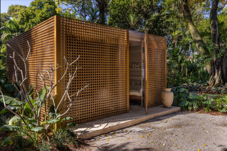 Muxarabi na fachada dá o tom do Bangalô das arquitetas Hannah Cabral e Monique Pampolha na CASACOR Rio