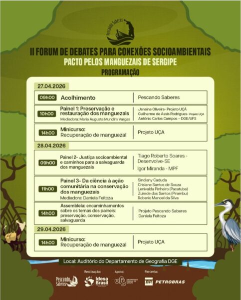 A salvaguarda e a restauração dos manguezais sergipanos serão o centro dos debates durante o II Fórum Pescando Saberes, que acontece entre os dias 27 e 29 de abril, no Auditório do Departamento de Geografia (DGE) da Universidade Federal de Sergipe (UFS). O evento é uma realização do Instituto de Desenvolvimento Vale do Cotinguiba (Idesa Brasil) em parceria com a Petrobras, e conta com o apoio institucional da UFS.