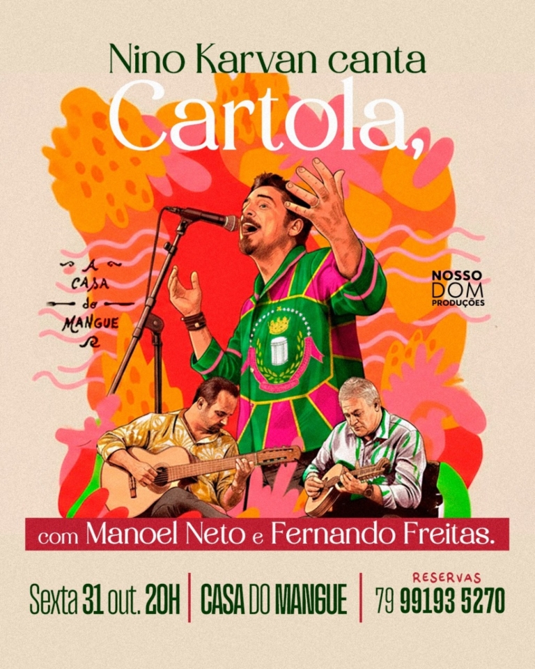 Depois do sucesso de público e crítica da estreia no Café da Gente Sergipana, o espetáculo “O Mundo é um Moinho: Nino Karvan canta Cartola” ganha sua segunda apresentação, desta vez na charmosa Casa do Mangue, no dia 31 de outubro de 2025, sexta-feira, às 20h. O show é um tributo intimista e emocionante a um dos maiores nomes da música brasileira, reunindo Nino Karvan ao lado de dois grandes mestres do choro e do samba instrumental: Fernando Freitas no bandolim e Manuel Neto no violão de sete cordas.