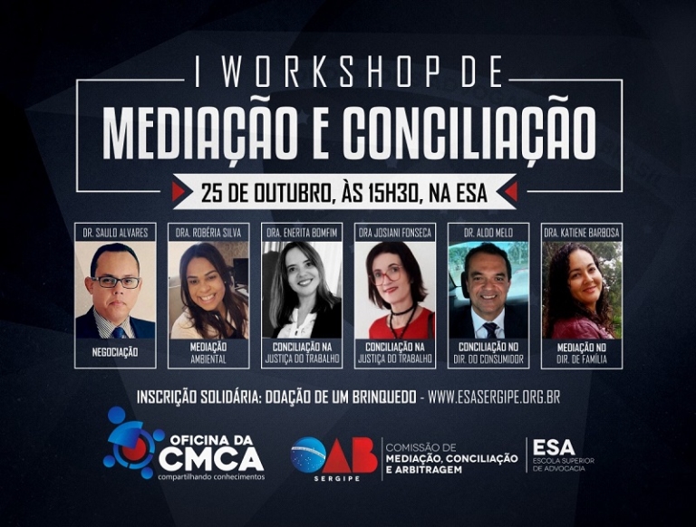 Promovido através da Comissão de Conciliação, Mediação e Arbitragem da OAB/SE e da Escola Superior de Advocacia do Estado, o workshop será gratuito e aberto ao público. As inscrições para o evento possuem viés solidário (01 brinquedo novo) e já podem ser realizadas aqui.