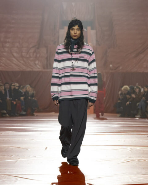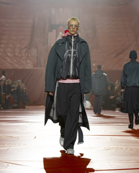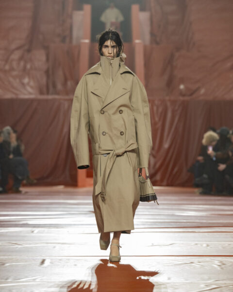 Após introduzir uma nova abordagem ao outerwear nas últimas temporadas, Pelagia aprofunda essa proposta por meio de impermeabilização e tecidos técnicos: o trench como base, o poncho como evolução da camisa polo, a lã tecnológica como proteção contra as chuvas. Peças acolchoadas e volumosas em náilon transparente, com acabamentos de aparência molhada ou refletiva, contrastam com veludo macio e a alfaiataria suave do emblemático blazer René. O crocodilo retorna em novas expressões marcantes, aplicado em bordados e emblemas que homenageiam o acervo da marca.