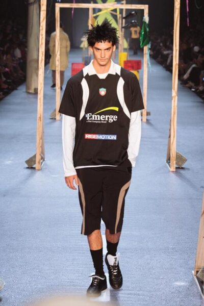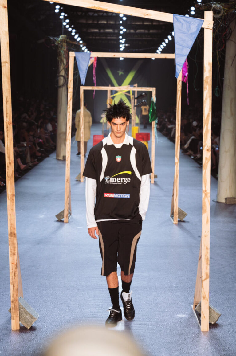 A cenografia trouxe referências diretas ao futebol de rua, com traves de madeira autoportantes, engradados de plástico desgastados, tijolos e chinelos, em alusão ao “golzinho” improvisado. A passarela apareceu com estética de asfalto e marcações de campo. Elementos garimpados pelo Rio de Janeiro como postes urbanos, paralelepípedos, latas com cimento e pares de tênis e chinelos usados ampliaram a construção de um cenário que evoca a vivência cotidiana das ruas e da memória afetiva com o esporte, em diálogo direto com a coleção.