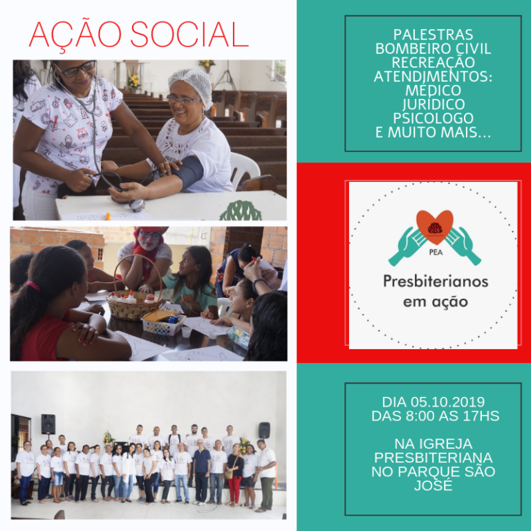 No próximo dia 5 de outubro das 8h às 17h, a comunidade do Loteamento Parque São José, em Nossa Senhora do Socorro, vai ser beneficiada com a realização de diversos serviços. A atividade social será desenvolvida pelo grupo Presbiterianos em Ação (PEA).