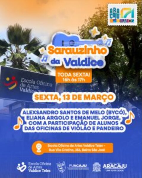 OO coordenador da Escola Oficina de Artes Valdice Teles, Luís Santana, destaca a proposta da programação. “Nossos professores prepararam um repertório dedicado aos 171 anos da nossa cidade. É Aracaju ao som da viola e do pandeiro na nossa escola, em uma linda mensagem de amor à nossa cidade. Esse é o espírito deste Sarauzinho especial, em comemoração ao aniversário da capital, que fazemos questão de celebrar com nossos professores e alunos”, afirma.