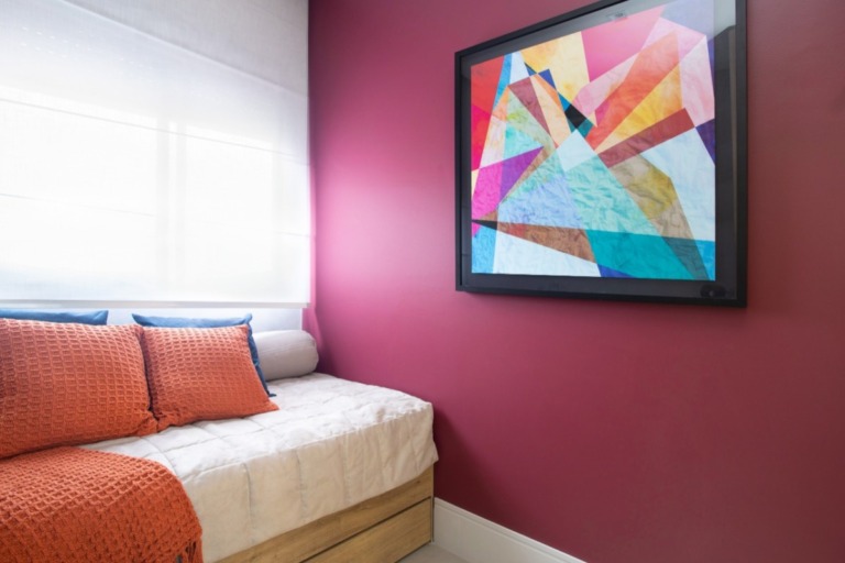 A proposta da LL Arquitetura (@ll.arqui) para este projeto foi destacar a cor aplicada na parede partindo das combinações do quadro com desenhos abstratos.