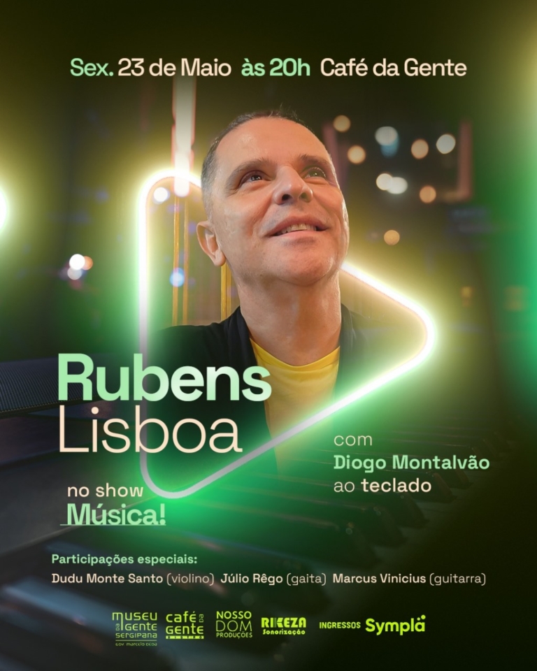O Espetáculo intimista acontece no dia 23 de maio e traz participações especiais de Dudu Monte Santo, Júlio Rêgo e Marcus Vinicius. Depois do sucesso de público e crítica dos seus últimos shows, sempre esgotando os ingressos em tempo recorde, Rubens Lisboa, um dos grandes nomes do cancioneiro sergipano, retorna aos palcos com um novo e emocionante espetáculo. No dia 23 de maio, às 20h, ele se apresenta no espaço cultural do Café da Gente Sergipana, anexo ao Museu da Gente Sergipana, com o show “Música!”, em formato intimista e repleto de emoção.