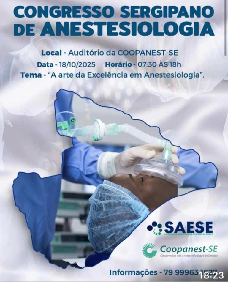 A Sociedade de Anestesiologia do Estado de Sergipe (Saese), em parceria com a Cooperativa dos Anestesiologistas de Sergipe (Coopanest-SE), realizará nos dias 17 e 18 de outubro o I Congresso Sergipano de Anestesiologia, que terá como tema central “A Arte da Excelência em Anestesiologia”. O evento acontecerá no auditório da nova sede da Coopanest-SE, localizada na Coroa do Meio, e deverá reunir cerca de 300 participantes entre médicos, residentes e estudantes.