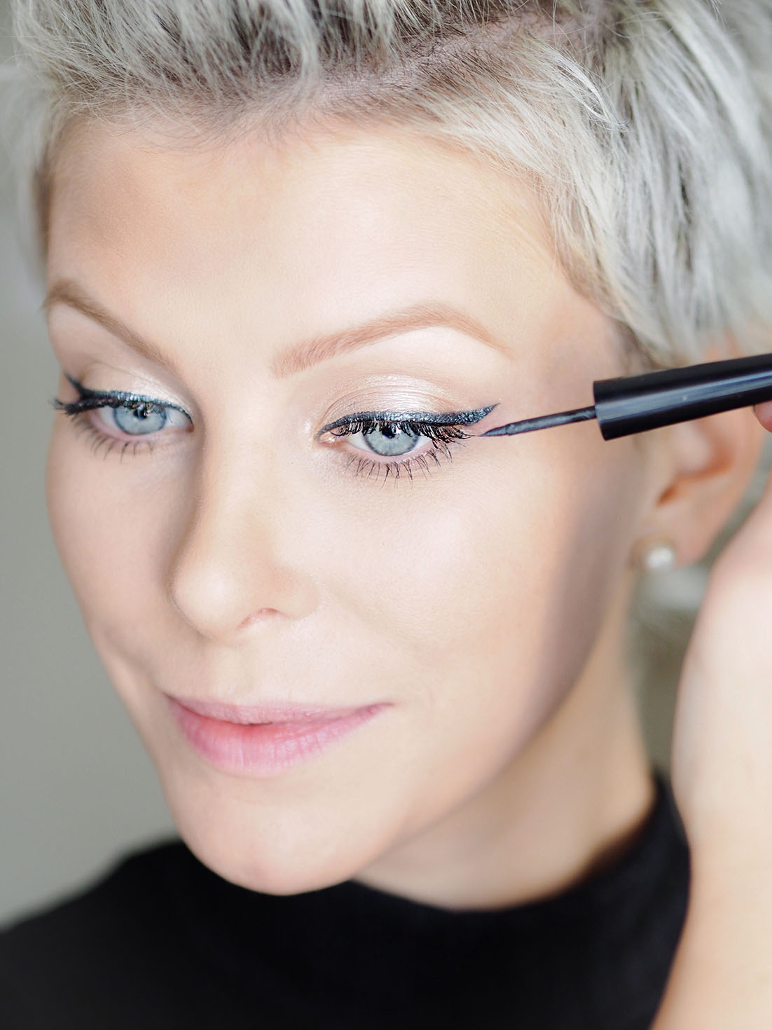 2. Com o Delineador Líquido preto, faça um delineado gatinho de traço fino;