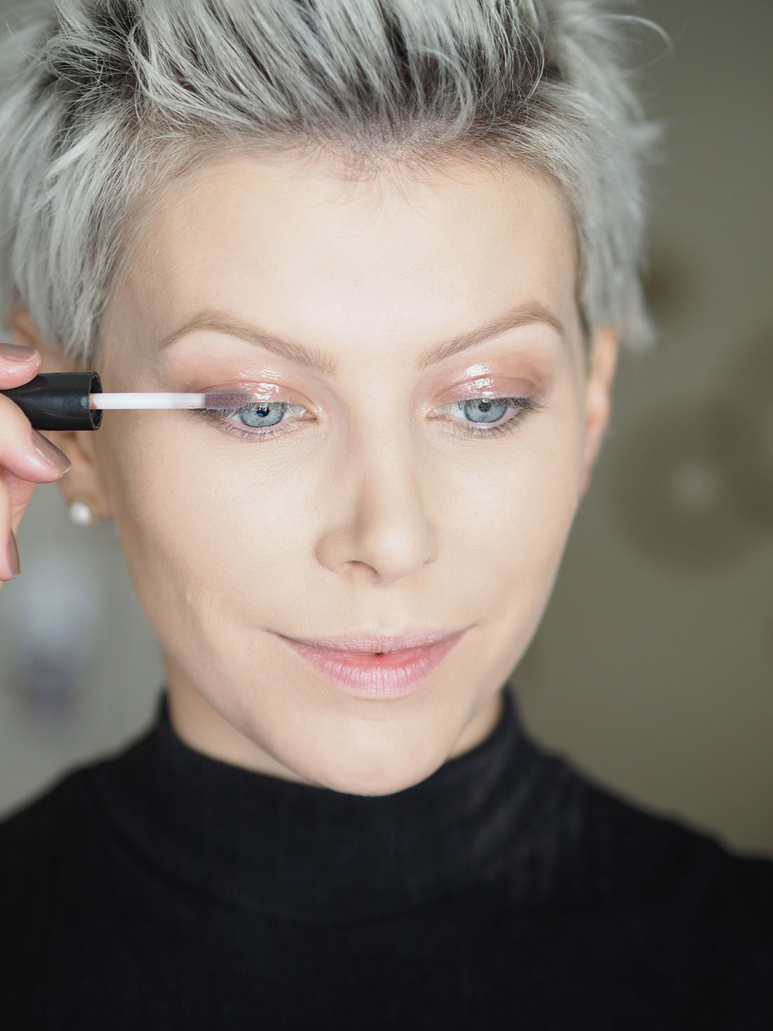 2. Aplique um gloss em um tom perolado nas pálpebras para um efeito glossy e iluminado.