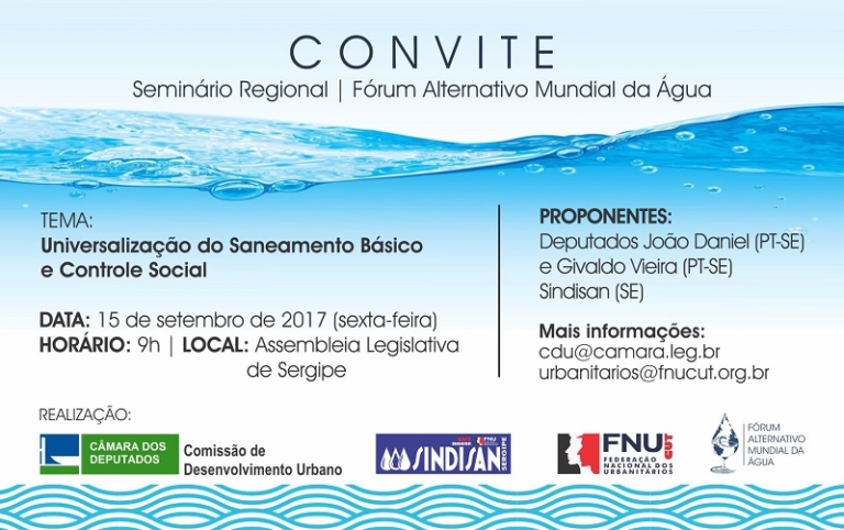 “Como uma das etapas da construção do Fórum Alternativo Mundial da Água, esse seminário será uma oportunidade de discutir, junto com trabalhadores do setor e estudiosos do tema, problemas relacionados à água e ao saneamento, como direito fundamental, considerando que o abastecimento de água e o esgotamento sanitário, bem como a recuperação e proteção das nascentes, das áreas de mananciais, e tantos outros temas relacionados ao desenvolvimento sustentável e uso racional da água”, destacou o deputado João Daniel.