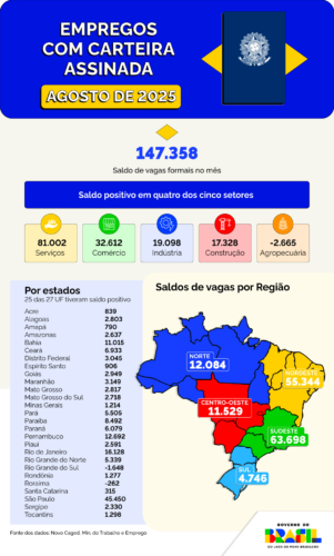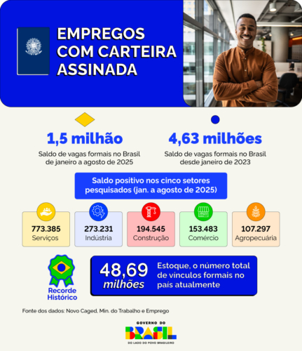 O Brasil superou 1,5 milhão de novos empregos com carteira assinada nos oito primeiros meses de 2025. Entre janeiro e agosto, foram criados 1.501.930 vínculos formais, com saldo positivo nos cinco grandes grupamentos de atividades econômicas. O resultado eleva para 48,69 milhões o estoque de vínculos no país, um recorde absoluto. Desde o início da atual gestão do Governo do Brasil, em janeiro de 2023, o saldo é de 4,63 milhões de vagas com carteira assinada.