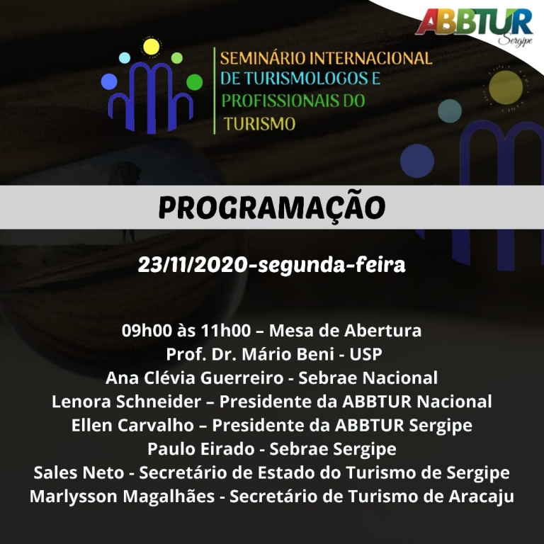 A organização do evento é da Associação Brasileira de Turismólogos e Profissionais do Turismo – ABBTUR – seccional Sergipe e a abertura magna do seminário será feita pelo guru do turismo brasileiro, o professor e doutor, Mário Beni – USP.