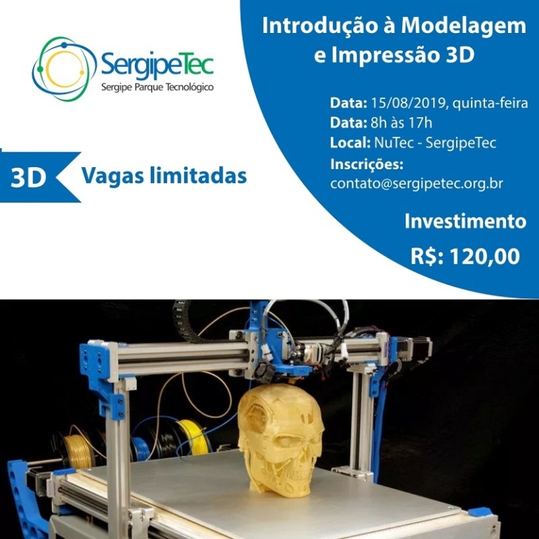 O Sergipe Parque Tecnológico – SergipeTec – vai realizar cursos de Introdução à Modelagem e Impressão 3D. E a primeira turma vai ser nesta quinta, 15, das 8h às 17h, na Sala de Treinamento do Núcleo de Desenvolvimento Tecnológico Regional – NuTec -, do Parque Tecnológico – Bloco B1. São 10 vagas. Inscrições em contato@sergipetec.org.br.