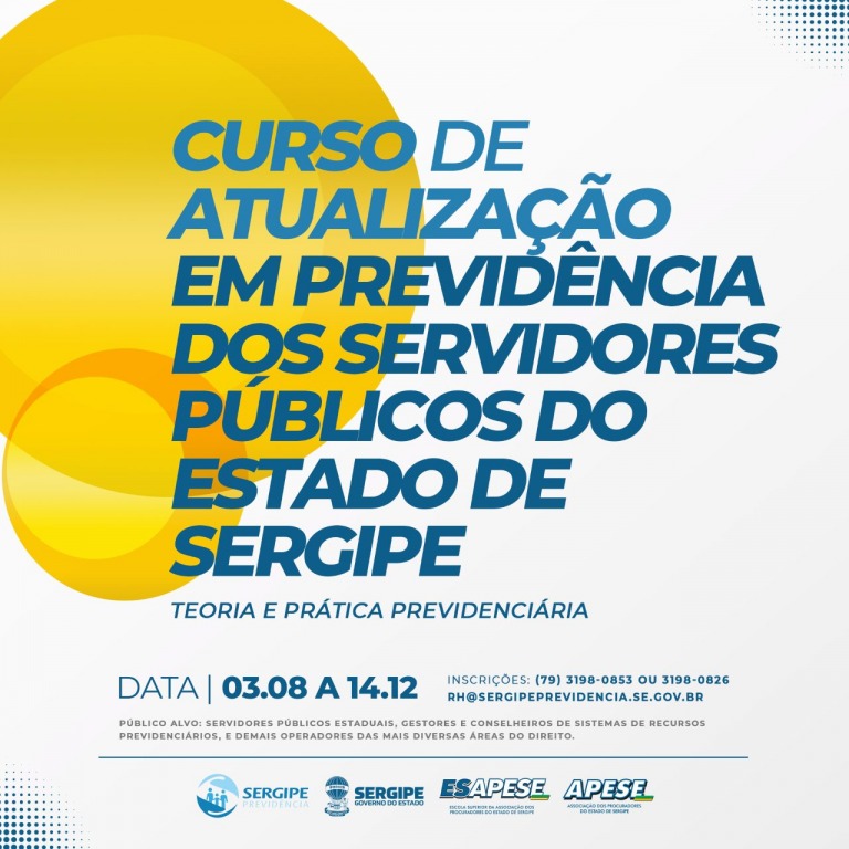 O curso de Atualização em Previdência de Servidores Públicos do Estado Sergipe – Teoria e Prática Previdenciária terá início nesta terça, 3 de agosto, às 14h, com a aula inaugural – e participação do diretor-presidente do SergipePrevidência e do presidente da Associação dos Procuradores do Estado de Sergipe (Apese) –, seguida do primeiro módulo. Integrante do Programa Estadual de Educação Previdenciária, o treinamento é direcionado aos servidores estaduais, a fim de otimizar o atendimento das secretarias e órgãos estaduais relacionados ao sistema de Previdência.