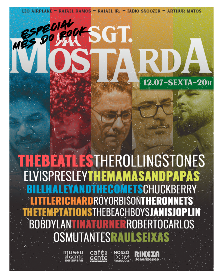 O quinteto Sgt. Mostarda retorna ao Café da Gente com um show especial para abrir as comemorações do mês do rock. O espetáculo, que dá início às atividades do mês dedicado ao gênero musical no espaço cultural do Café da Gente Sergipana, promete celebrar a diversidade do rock and roll nacional e internacional. Os fãs podem esperar por uma viagem emocionante pela história do rock, com releituras fiéis dos arranjos e canções que marcaram gerações.