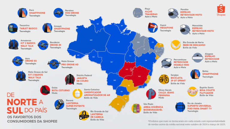 A Shopee, marketplace que conecta vendedores e consumidores, divulga o primeiro Mapa Shopee de 2025 mostrando as preferências e o comportamento de compra dos brasileiros. O levantamento, que conta com as categorias e os itens mais vendidos nos estados brasileiros, considera os produtos que tiveram pedidos acima da média nacional entre outubro de 2024 e março de 2025.