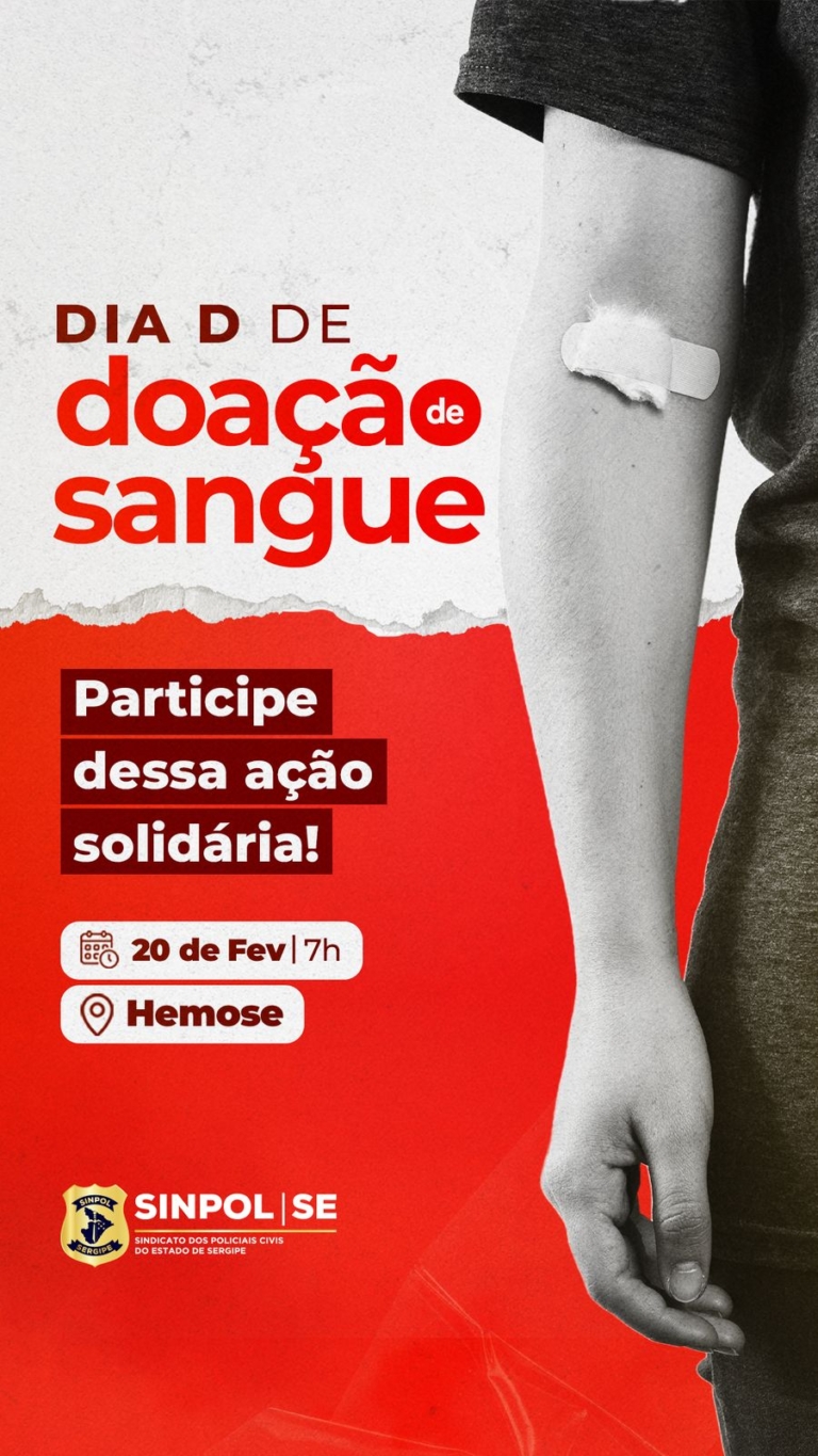 O Sindicato dos Policiais Civis do Estado de Sergipe (Sinpol/SE) convida os filiados e toda sociedade para um ato de empatia e compromisso com a vida! No próximo dia 20 de fevereiro, às 7h, será realizado o “Dia D de Doação de Sangue”, no Centro de Hemoterapia de Sergipe (Hemose), em Aracaju. A iniciativa tem como principal objetivo reforçar os estoques de sangue do Hemose para o período do Carnaval, um momento em que a demanda por transfusões aumenta significativamente.