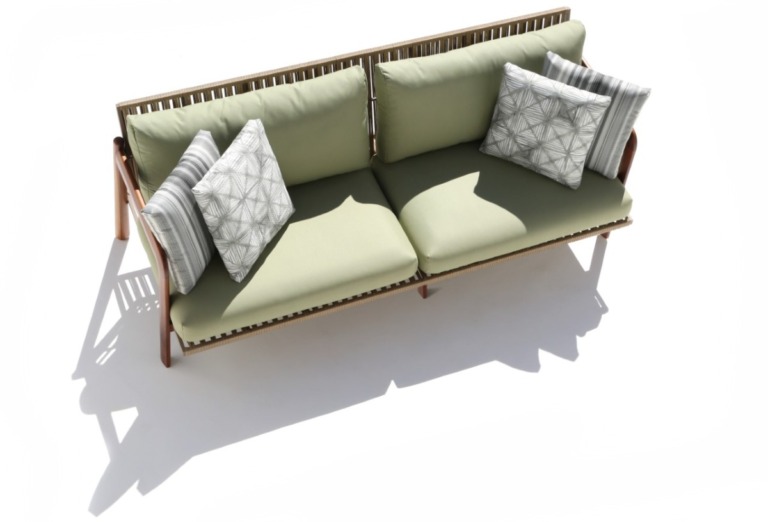Desenho orgânico inspirado nas barreiras de corais marinhos, sugerem um design generoso no mix de materiais, materializado na seleção da madeira náutica de teca, tubo de alumínio e no concreto unicelular.