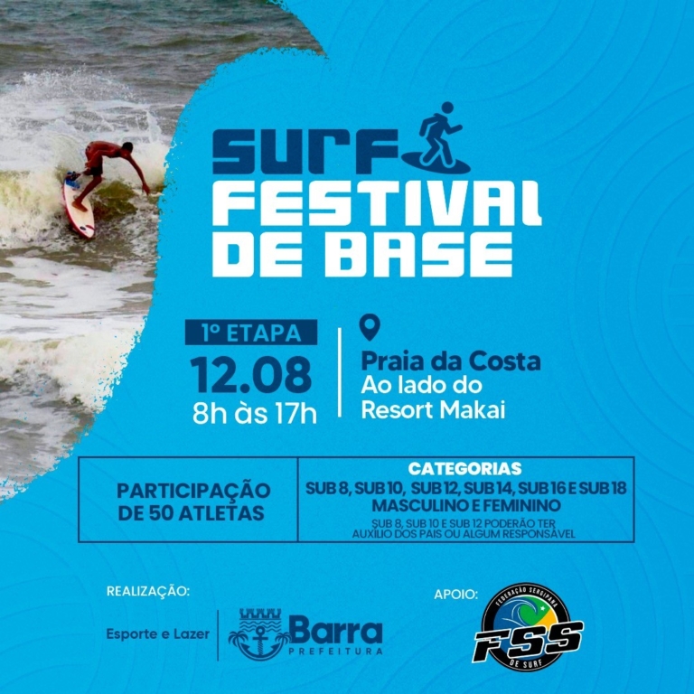 A Praia da Costa, na Barra dos Coqueiros, será palco neste sábado, 12, do “Surf Festival de Base”. O evento é uma realização da Prefeitura de Barra dos Coqueiros, através da Secretaria Municipal de Esporte e Lazer, e conta com apoio da Federação Sergipana de Surf.