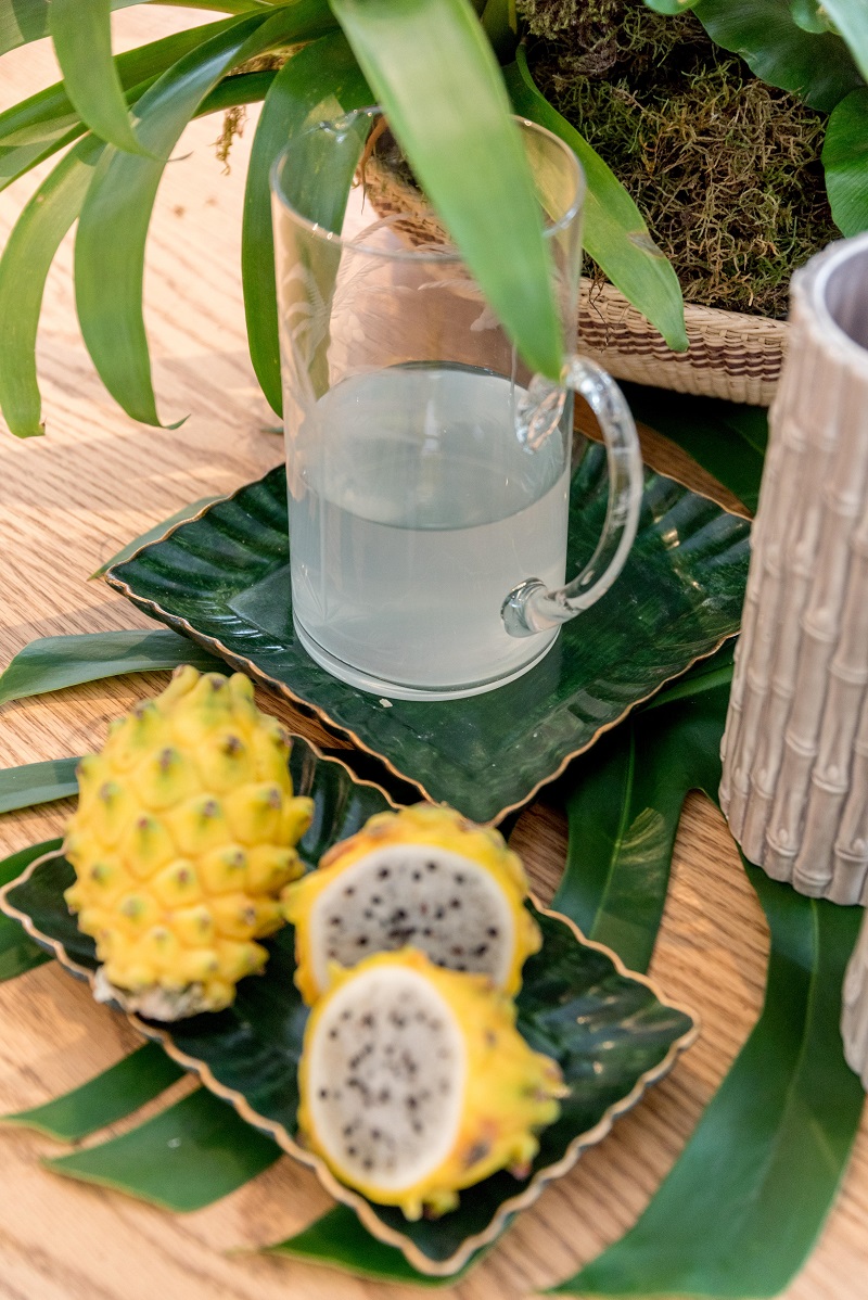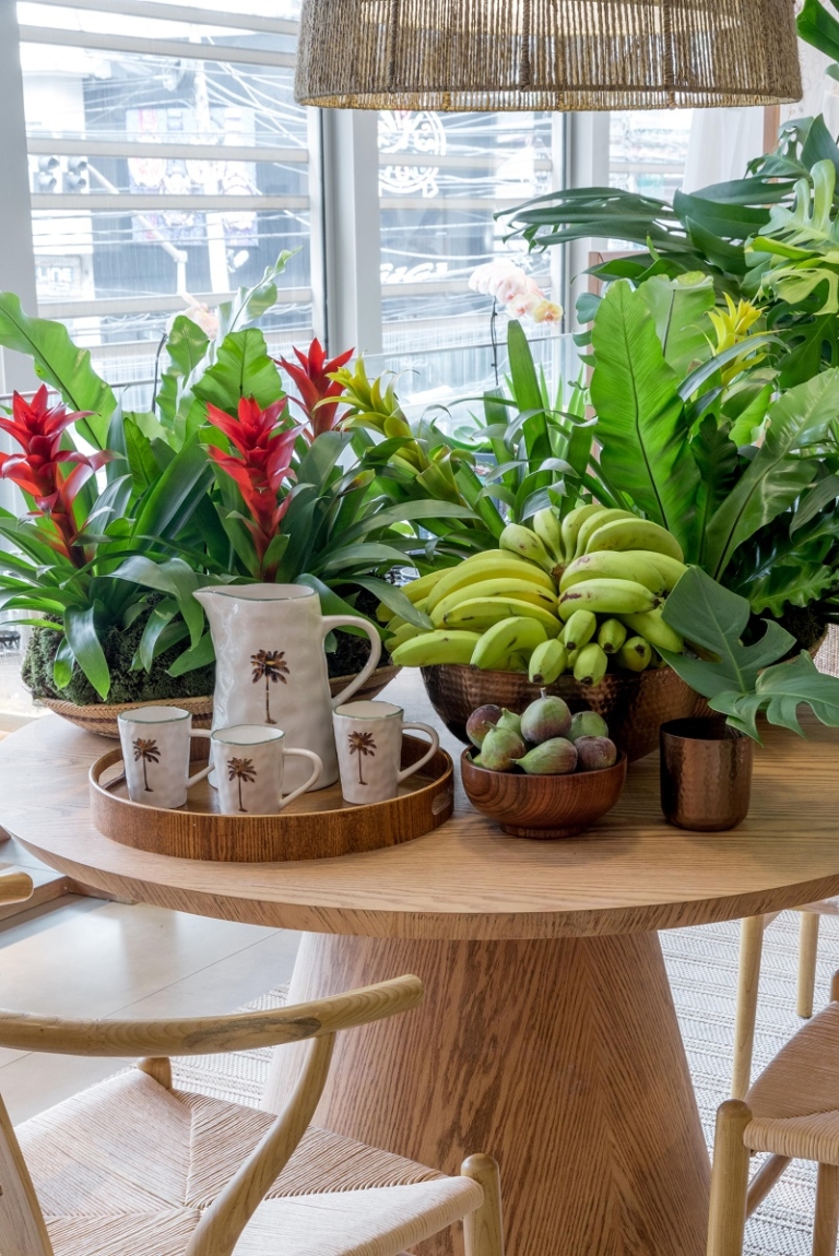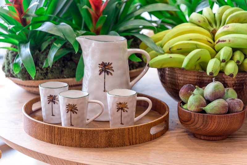 A linha conta com artigos de decoração como cerâmicas, espelhos, bandejas, vasos, almofadas e porta retratos e possui ainda uma linha de mesa posta com taças e talheres que vão transformar as mesas mais despretensiosas em um acontecimento. Madeira e palha são os materiais com maior presença nas peças que contam com uma paleta marcada pelo dourado e pelos tons terrosos. As peças em formatos de abacaxis, folhagens, arabescos e palmeiras (substituir por coqueiros) – marca registrada da Água de Coco por Liana Thomaz – ganham destaque na coleção.