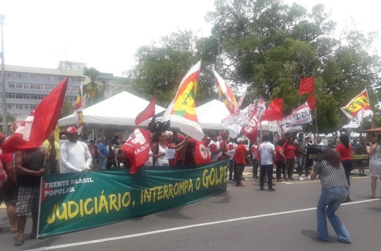 Na manhã desta terça-feira, 16, os trabalhadores do Tribunal de Justiça de Sergipe – TJSE -, Central Única dos Trabalhadores – CUT/SE – e demais entidades sindicais e da sociedade, reunidas na Frente Brasil Popular, realizam um ato em frente ao Palácio da Justiça, no Centro de Aracaju.