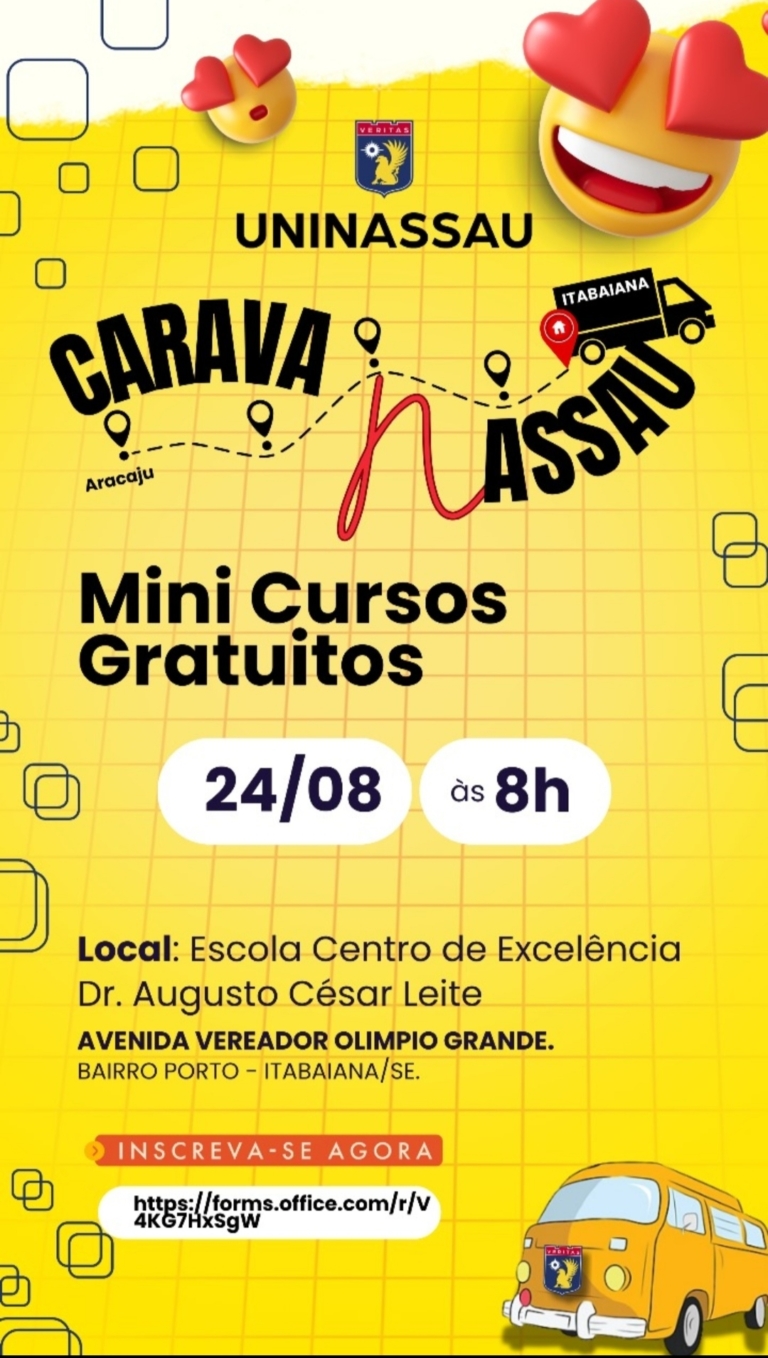 O Uninassau – Centro Universitário Maurício de Nassau Aracaju oferta minicursos de capacitação e alguns serviços no município de Itabaiana. A “Caravanassau” acontece no próximo sábado, 24, a partir das 8h, no Centro de Excelência Dr. Augusto César Leite, localizado na Avenida Vereador Olímpio Grande, bairro Porto.