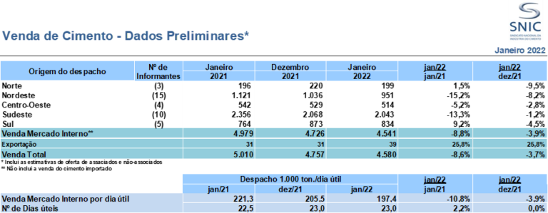 A indústria do cimento registrou um início de ano com desempenho de vendas desfavorável. A comercialização do insumo no Brasil em janeiro totalizou 4,6 milhões de toneladas, quedas de 8,6% em relação ao mesmo mês de 2021 e de 3,7% frente a dezembro último, de acordo com o Sindicato Nacional da Indústria de Cimento – SNIC.